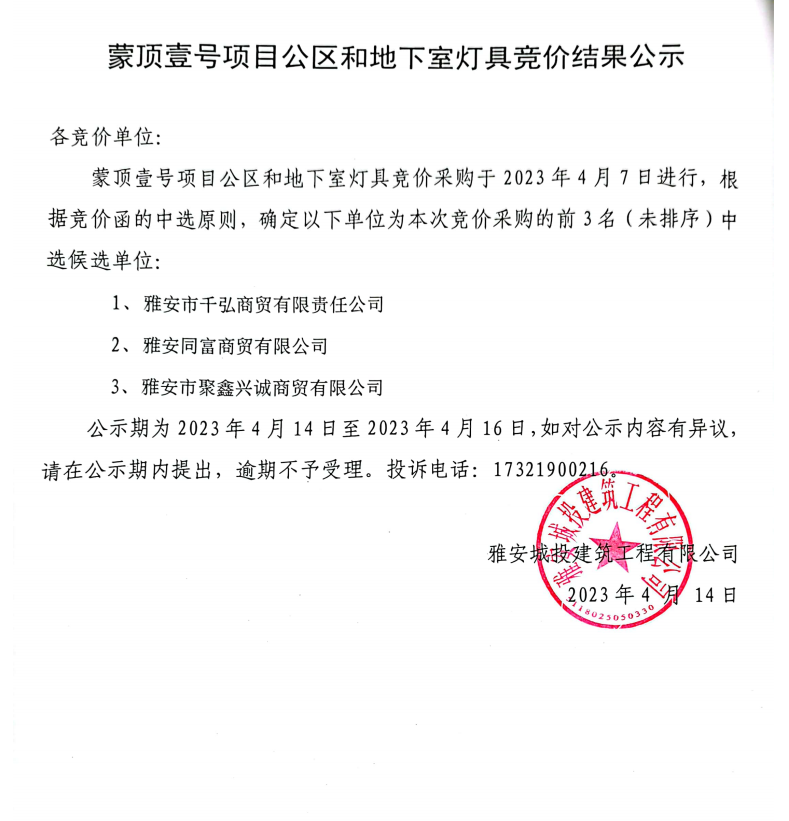 蒙頂壹號項目公區(qū)和地下室燈具競價結果公示