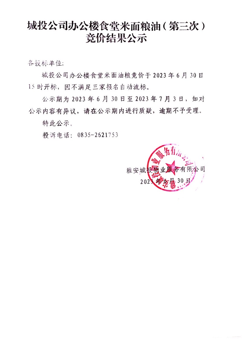 城投公司辦公樓食堂米面糧油(第三次)競價結(jié)果公示
