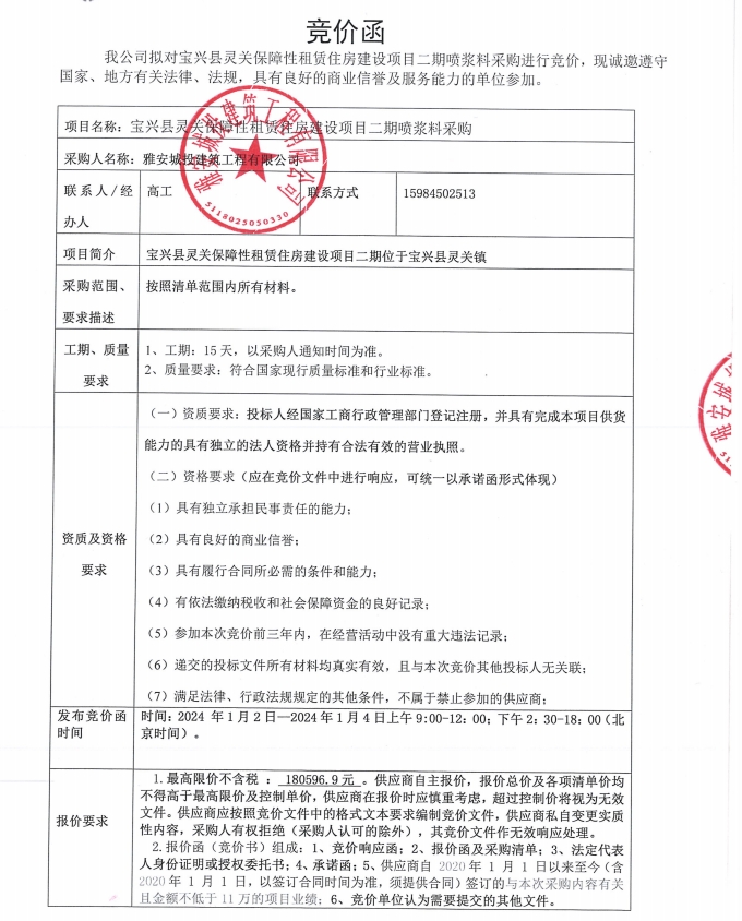 寶興縣靈關(guān)保障性租賃住房建設(shè)項(xiàng)目二期噴漿料采購競(jìng)價(jià)公告