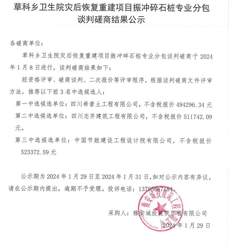 草科鄉(xiāng)衛(wèi)生院災后恢復重建項目振沖碎石樁專業(yè)分包談判磋商結(jié)果公示