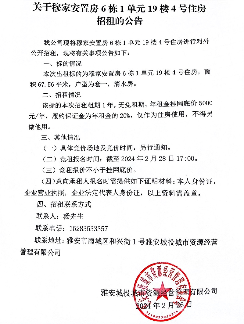 關于穆家安置房6棟1單元19樓4號住房招租的公告