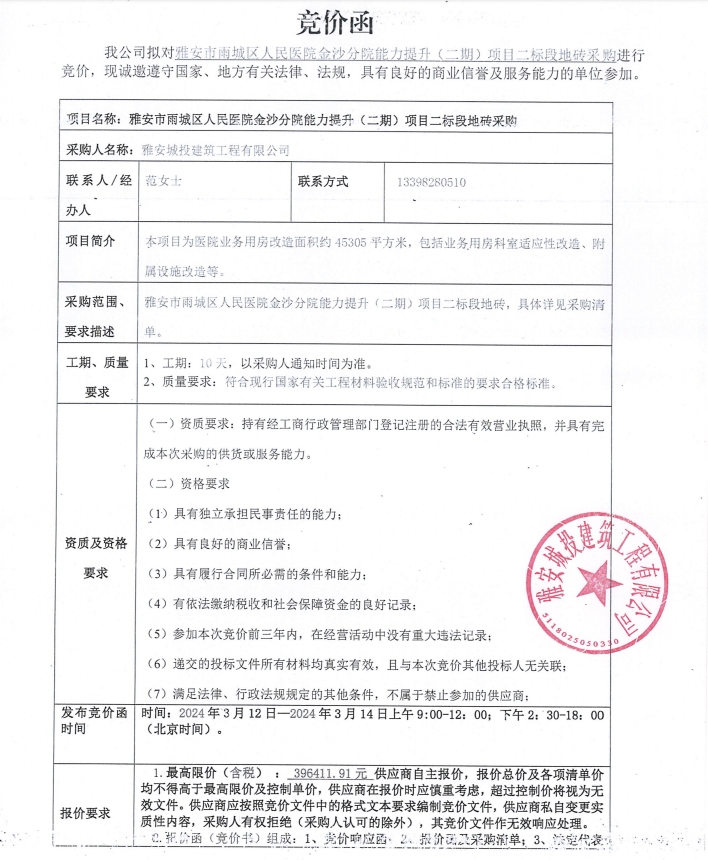 雅安市雨城區(qū)人民醫(yī)院金沙分院能力提升(二期)項(xiàng)目二標(biāo)段地磚采購(gòu)競(jìng)價(jià)公告