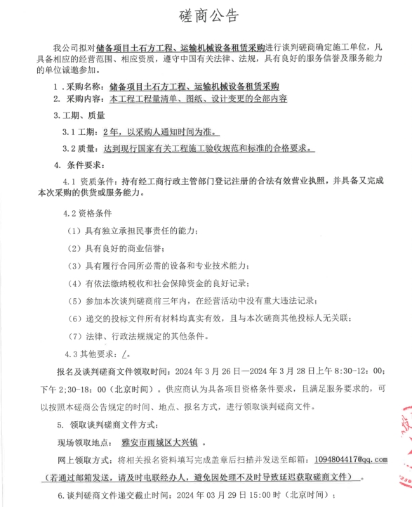 儲(chǔ)備項(xiàng)目土石方工程、運(yùn)輸機(jī)械設(shè)備租賃采購(gòu)磋商公告