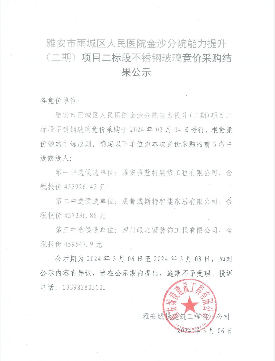 雅安市雨城區(qū)人民醫(yī)院金沙分院能力提升(二期)項(xiàng)目二標(biāo)段不銹鋼玻璃競(jìng)價(jià)采購(gòu)結(jié)果公示