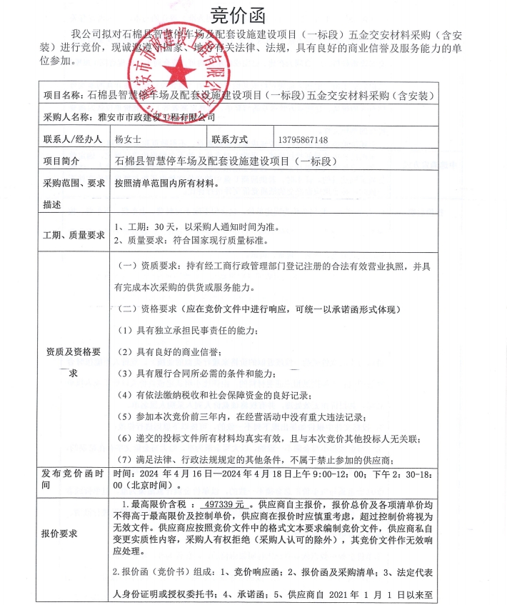 石棉縣智慧停車場及配套設施建設項目(一標段)五金交安材料(含安裝)競價公告