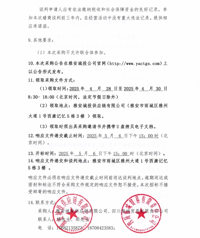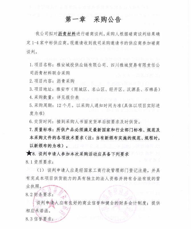 雅安城投供應(yīng)鏈有限公司、四川雅城貿(mào)易有限責任公司瀝青材料聯(lián)合采購公告