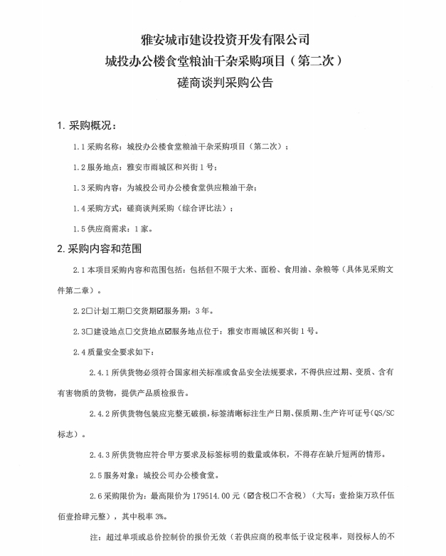 雅安城市建設投資開發(fā)有限公司辦公樓食堂干雜采購項目(第二次)磋商談判采購公告