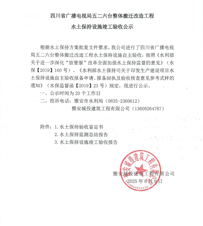 四川省廣播電視局五二六臺整體搬遷改造工程水土保持設(shè)施竣工驗(yàn)收公示